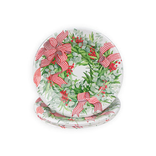 In our Ribbon Stripe Wreath design, artist Ingrid Slyder paints bay leaves sprigged with eucalyptus and berries for a refreshing, contemporary look woven with whimsical red and white ribbon. We paired it with holiday reds and blonde rattan to keep things light.