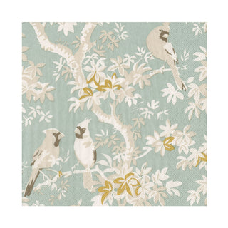 Painterly song birds perch along the branches of twisting gilded oak trees against a celadon backdrop, reminiscent of classic chinoiserie panels, which pull the grander scale of your home down to your table.
